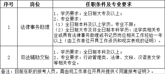 (2)全日制大专学历及非全日制本科学历:法学类相关专业或具有法律事务助理或书记员岗位相关工作经验一年以上。(由工作单位开具工作资历和现实表现的证明)。