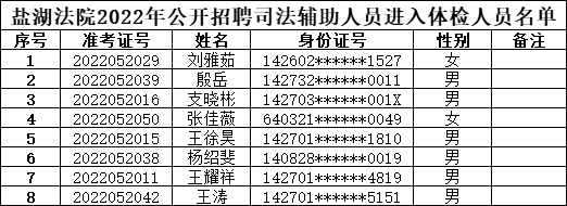 根据《盐湖区人民法院2022年司法辅助人员招聘公告》相关要求,经过网上报名、资格审查、初试、面试等环节,现就面试成绩查询及体检有关事项通知如下: