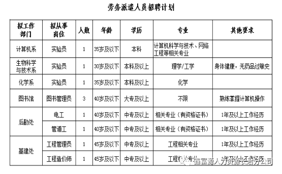 管道工1人:40周岁及以下男性(1979年7月31日之后),中专以上学历,1年以上工作经历,专业不限,有资格证者优先;