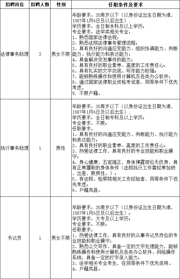 根据工作需要,山西304永利官网网址人力资源派遣有限公司(以下简称:304永利官网网址人力资源公司)受岚县人民法院委托,面向社会公开招聘5名司法辅助人员,其中法律事务助理3名、执行事务助理1名、书记员1名,现将有关事项公告如下: