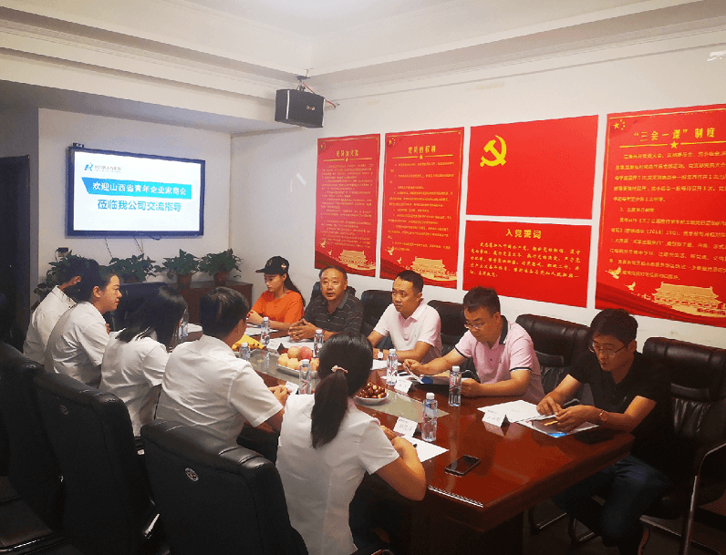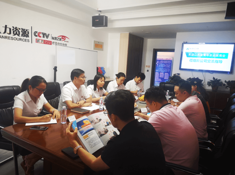 2019年9月4日下午3时,山西省青年企业家商会副会长张东红(山西海通工程招标代理有限公司总经理)、常务理事王志(上海妙施投资咨询有限公司总经理)、理事王志刚(山西慧致印业有限公司总经理)、秘书处主任杨振华、秘书处职员高冰玉等代表莅临我公司交流座谈。董事长韩红光、总经理李小芳陪同青商会代表参观了公司,并进行座谈。项目运营部经理郭花萍、综合管理部经理刘莉出席了本次会议。