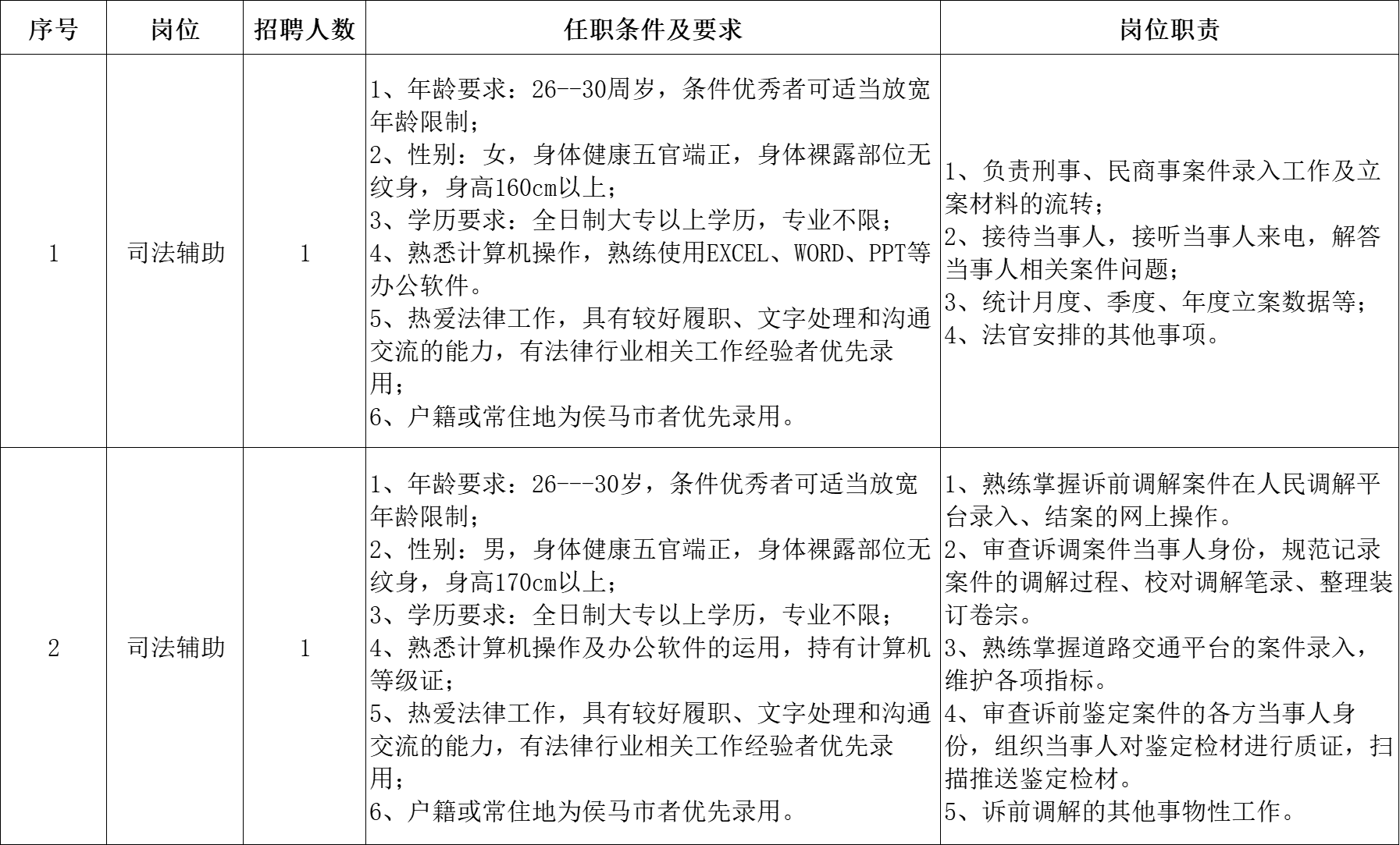 根据工作需要,临汾市侯马市人民法院委托山西304永利官网网址人力资源派遣有限公司(以下简称:304永利官网网址人力资源公司),面向社会公开招聘2名司法辅助人员,现将有关事项公告如下:
