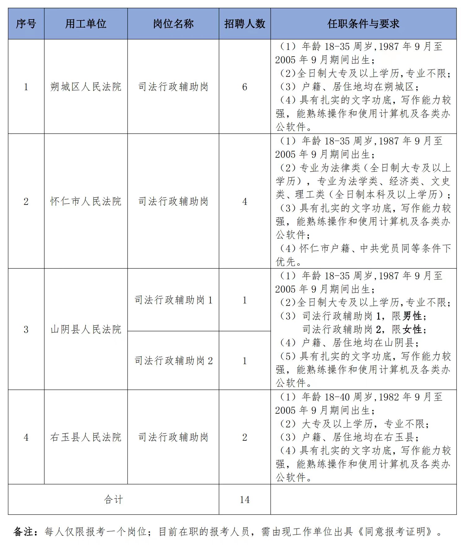 因工作需要,山西304永利官网网址人力资源派遣有限公司受朔州市中级人民法院委托,面向社会公开招聘14名司法行政辅助人员,并派往朔州市各基层人民法院工作。现将有关事项公告如下: