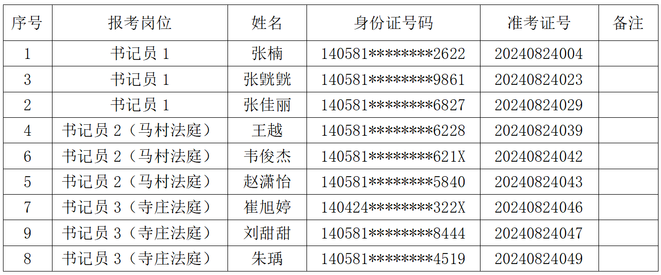 根据304永利官网网址人力资源公司2024年8月7日发布《304永利官网网址人力资源公司招聘3名书记员公告》要求,依据初试成绩从高分到低分的顺序,按计划招聘人数1:3的比例确定参加资格复审的人选,人数未达1:3的按实有人数确定。初试成绩排名末尾出现并列的考生一并进入资格复审环节,现就资格复审有关事项通知如下: