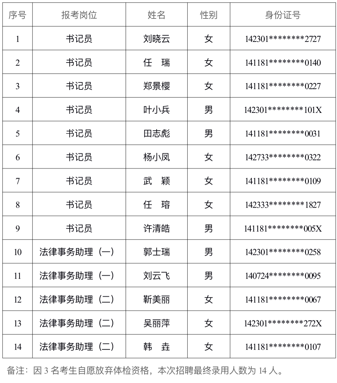 根据《孝义市人民法院2024年招聘17名司法辅助人员公告》的相关要求,经网上报名、理论考试、速录测试、及面试、体检、政审等环节,现将符合拟录用条件的司法辅助人员名单及储备人员名单公示如下: