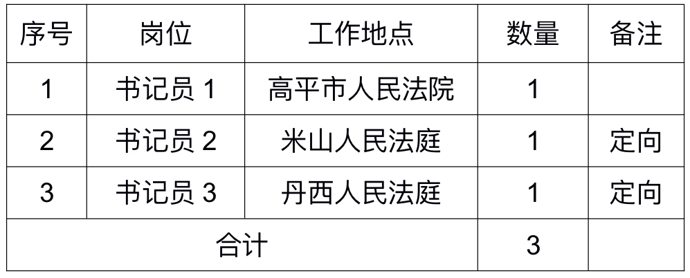 说明:书记员2、书记员3岗位定向任职米山、丹西人民法庭工作,合同期内不能定向任职的解除劳动合同;居住地在米山镇、河西镇的优先录用。