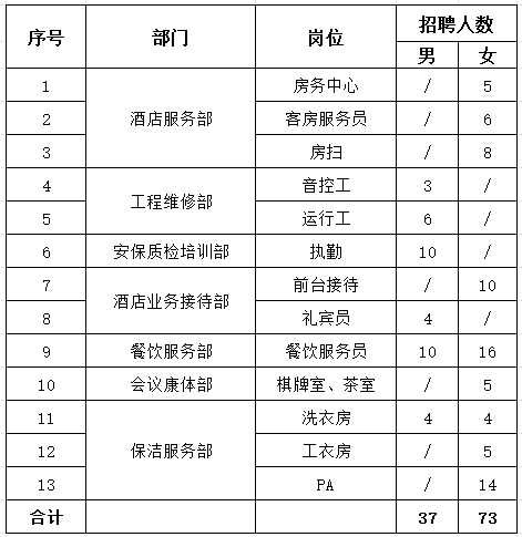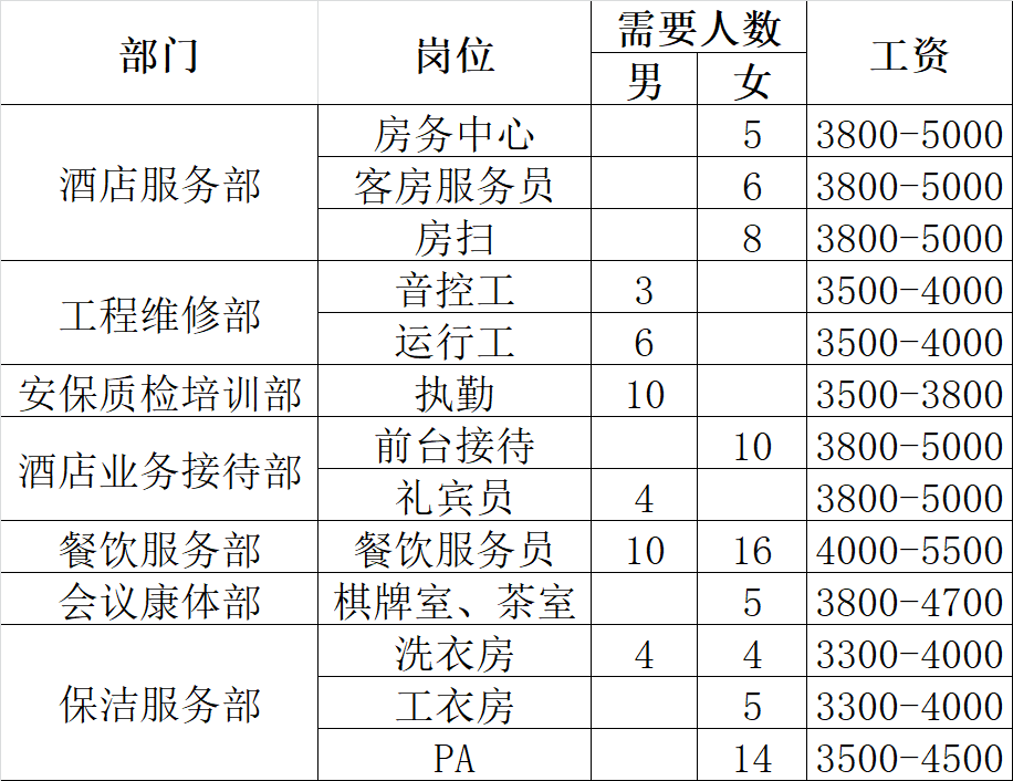 根据工作需要,304永利官网网址人力资源集团公开招聘110名工作人员,并外派至汾酒国际大酒店工作,现将有关事项公告如下: