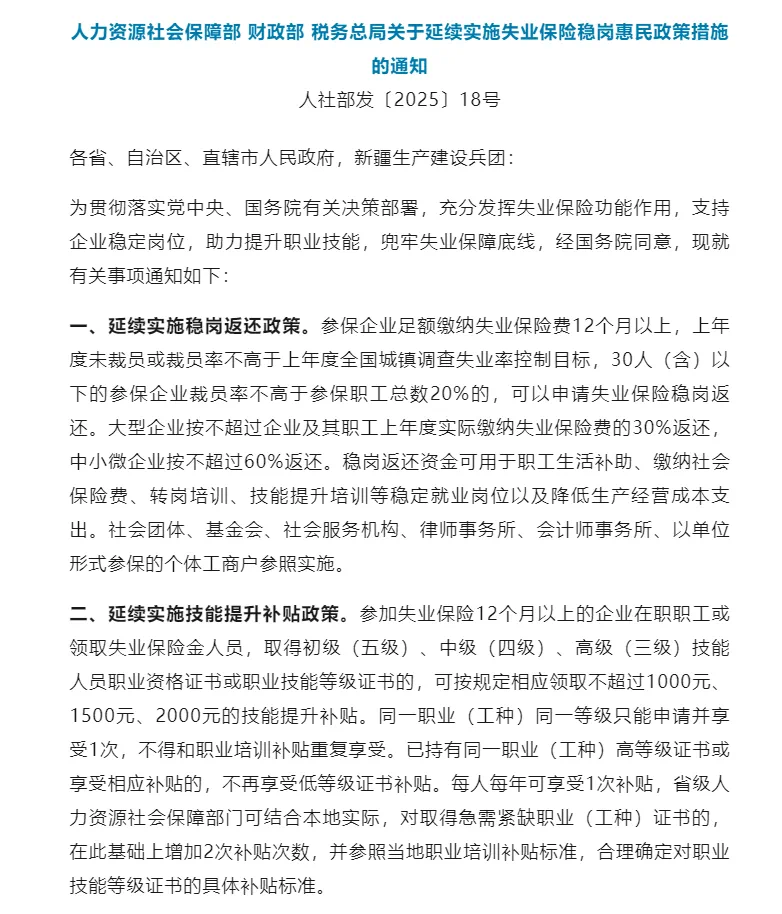 根据《人力资源社会保障部 财政部 税务总局关于延续实施失业保险稳岗惠民政策措施的通知》(人社部发〔2025〕18号),参加失业保险12个月以上的企业在职职工或领取失业保险金人员,取得初级(五级)、中级(四级)、高级(三级)技能人员职业资格证书或职业技能等级证书的,可按规定相应领取不超过1000元、1500元、2000元的技能提升补贴。