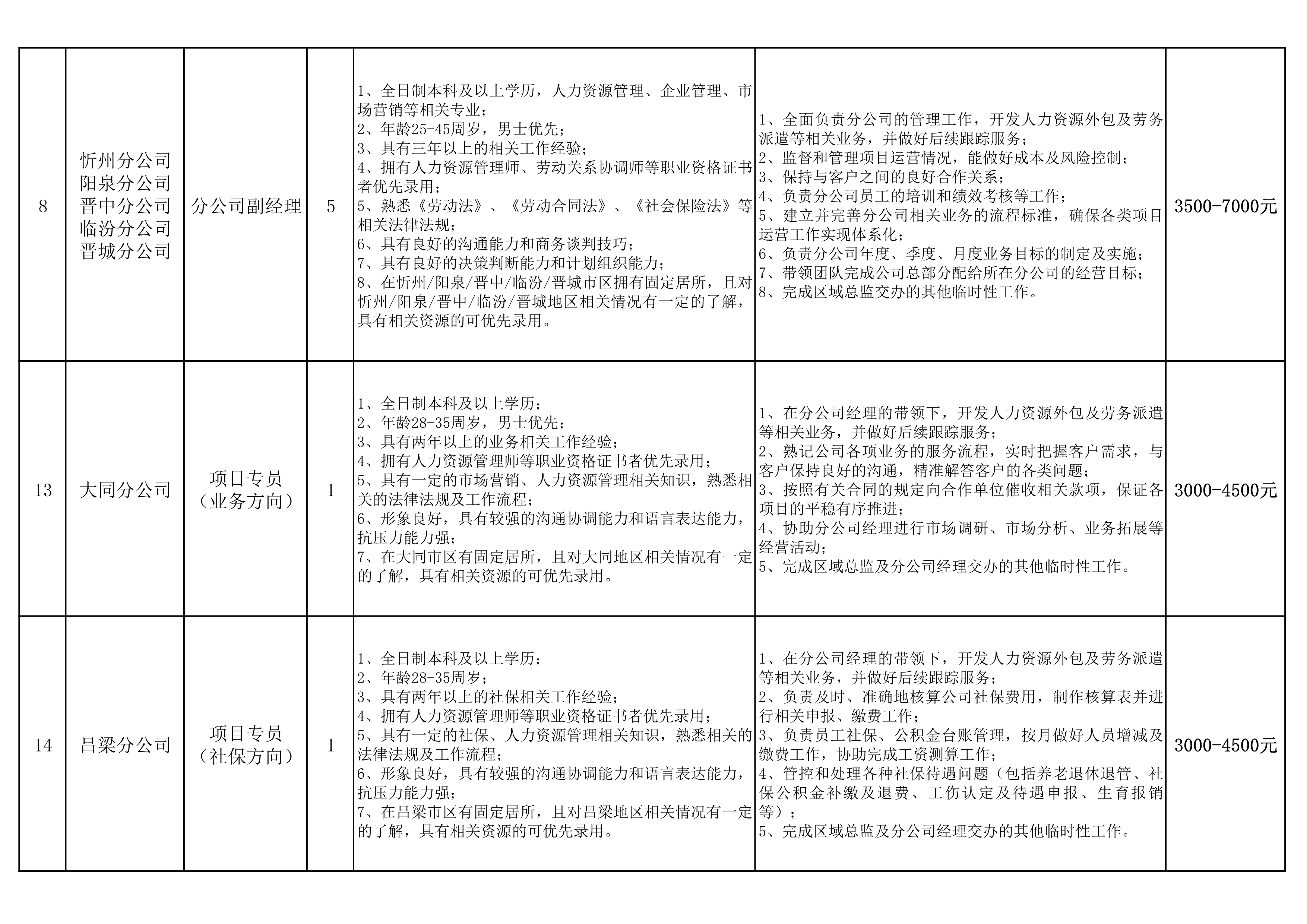 分公司:分公司副经理5名(忻州、阳泉、晋中、临汾、晋城),大同分公司项目专员(业务方向)1名,吕梁分公司项目专员(社保方向)1名。