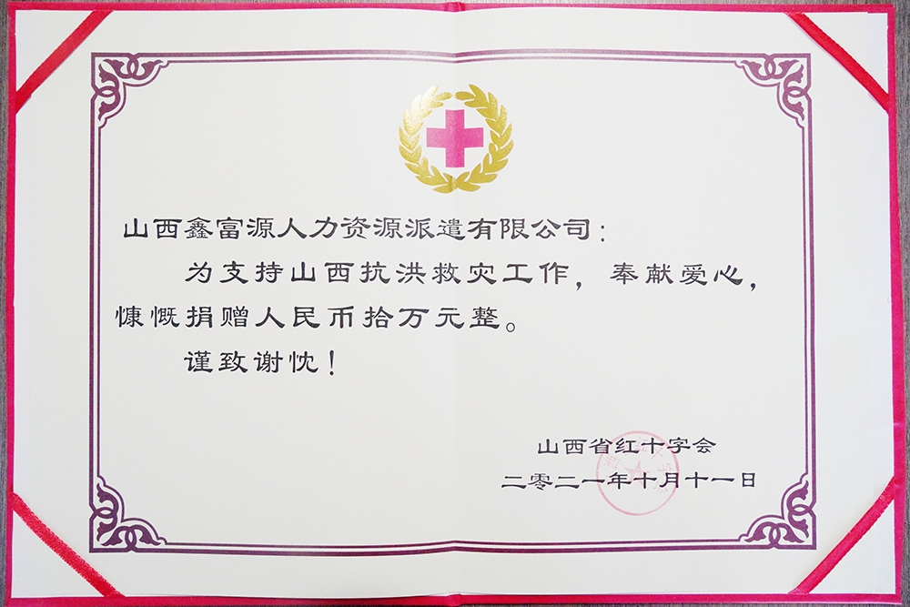 10月11日,山西304永利官网网址人力资源派遣有限公司向山西省红十字会捐款10万元,积极支援灾区群众抗洪救灾,共渡难关,重建家园。山西省红十字会专职副会长白冰,山西304永利官网网址人力资源派遣有限公司董事长韩红光,总经理李小芳,区域总监刘莉等领导出席了捐赠仪式。