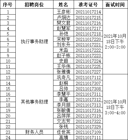 根据304永利官网网址人力资源公司2021年9月30日发布的忻州市忻府区人民法院公开招聘劳务派遣制司法辅助人员招聘公告的要求,经过网上报名、资格审查、理论考试、体能测试、速录技能测试等环节,现就面试有关事项通知如下: