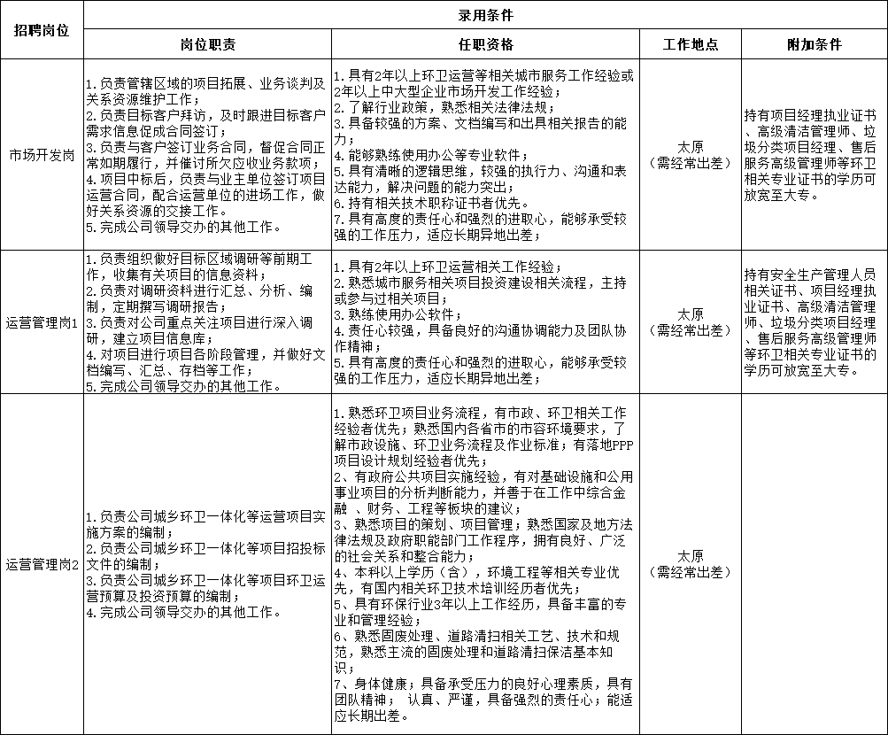 为适应山西大地清尘环保科技有限公司(以下简称“大地清尘”)全方位高质量发展的需要,根据实际工作需求,现面向社会公开招聘工作人员4名(其中市场开发岗1名,运营管理岗3名),现就有关事项公告如下:
