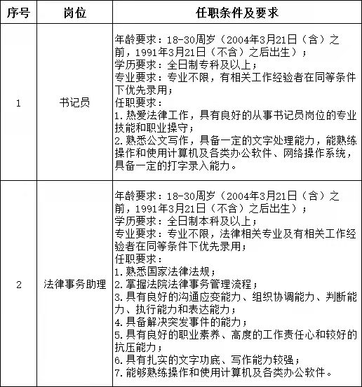 根据工作需要,长治市黎城县人民法院公开招聘10名司法辅助人员(其中书记员2名,法律事务助理8名),由山西304永利官网网址人力资源派遣有限公司(以下简称:304永利官网网址人力资源公司)招录并派遣至长治市黎城县人民法院工作,现将有关事项公告如下: